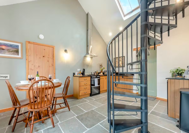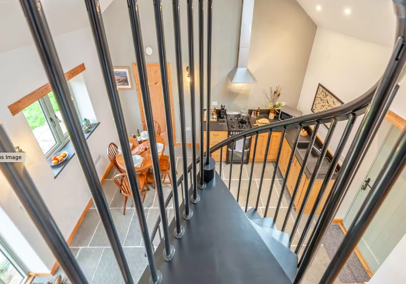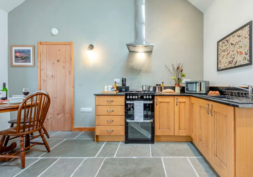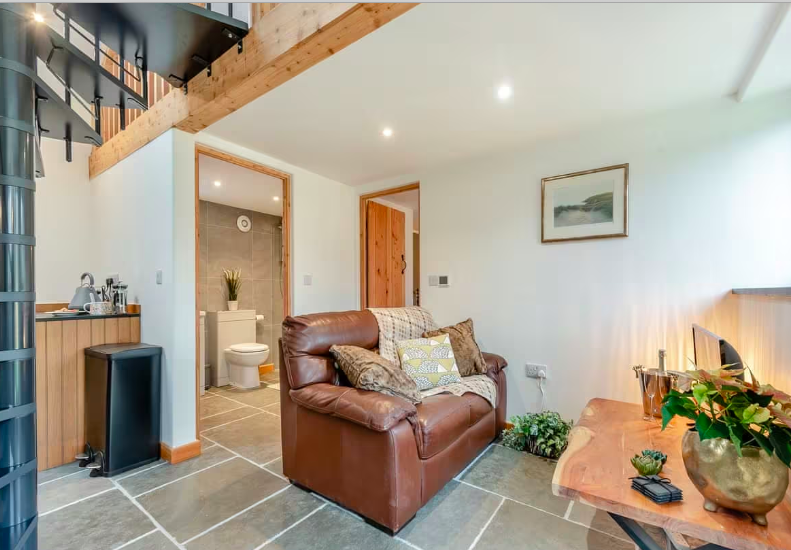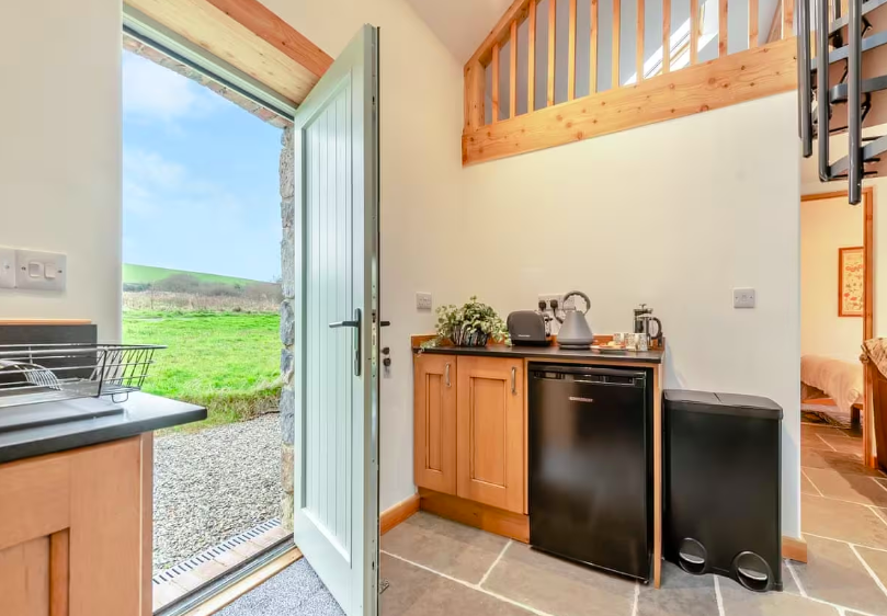 Immediately as you step inside you will sense Meadowsweet's distinctive character and superb high end finish. The interior is adorned with exposed beams, vaulted ceilings and stone floors with underfloor central heating. A spiral staircase leads you to the mezzanine level, where a cosy twin bedroom awaits, adding a touch of whimsy to your stay. The open plan solid oak kitchen has granite worktops that gives the area a real sense of quality and charm.