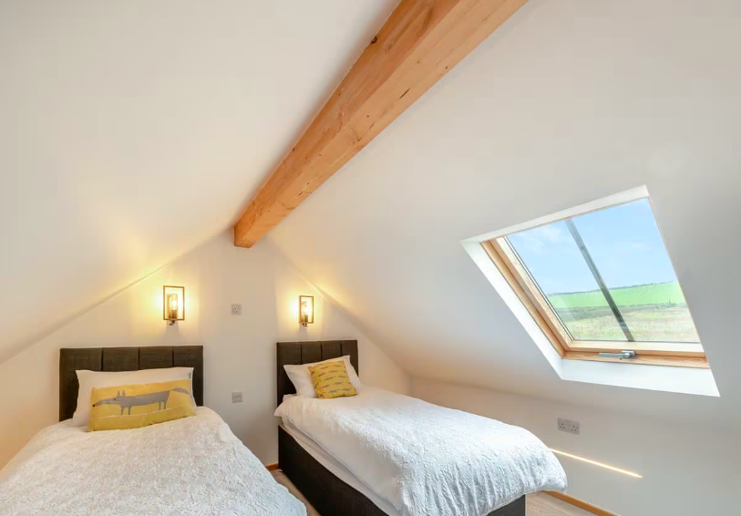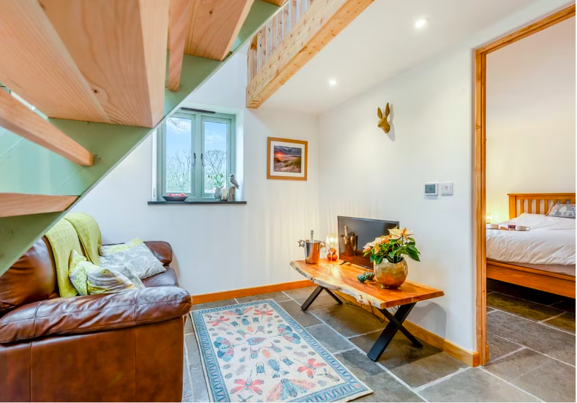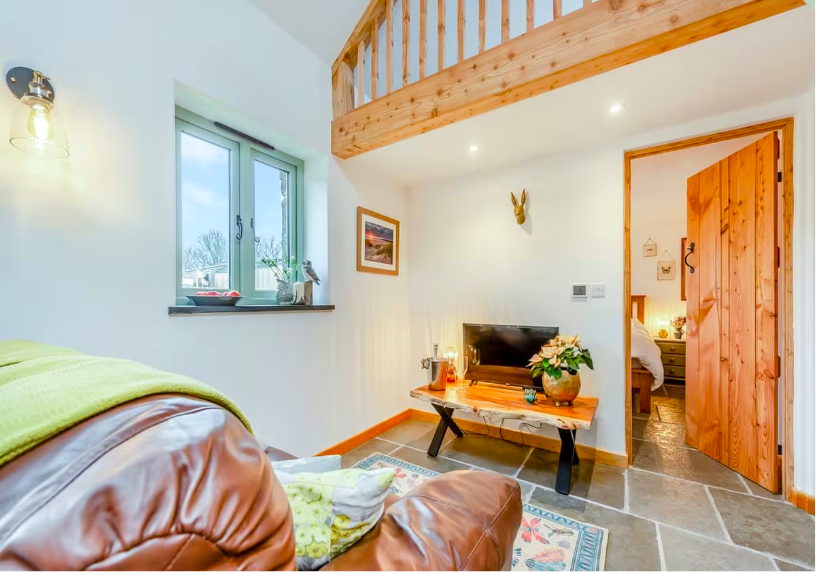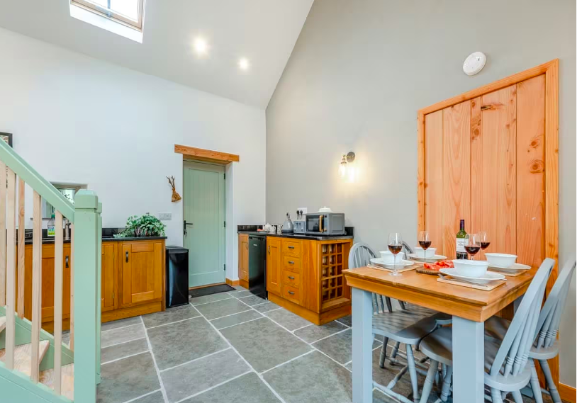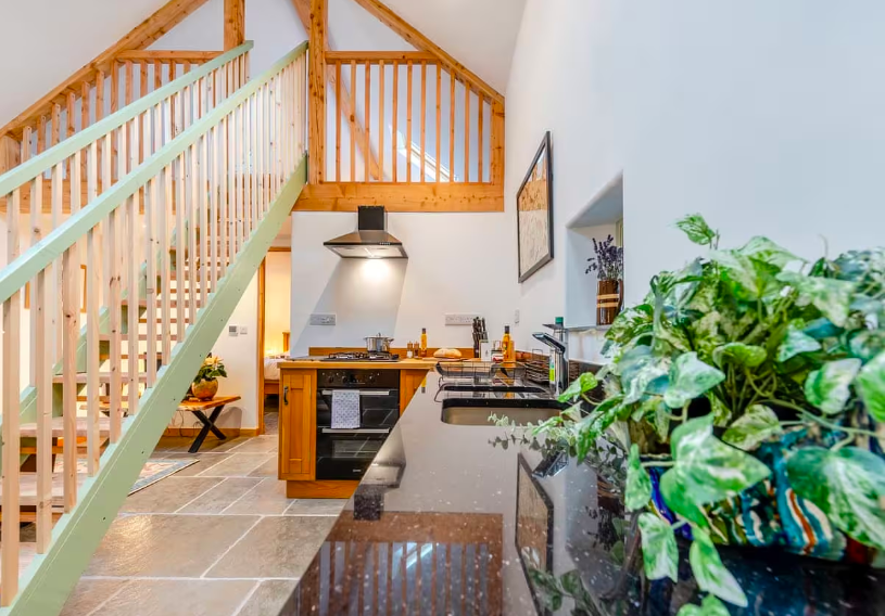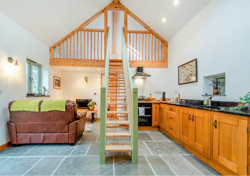 Immediately as you step inside you will sense Teasel's distinctive character and superb high end finish. The interior is adorned with exposed beams, vaulted ceilings and stone floors with underfloor central heating. A spiral staircase leads you to the mezzanine level, where a cosy twin bedroom awaits, adding a touch of whimsy to your stay. The open plan solid oak kitchen has granite worktops that gives the area a real sense of quality and charm.