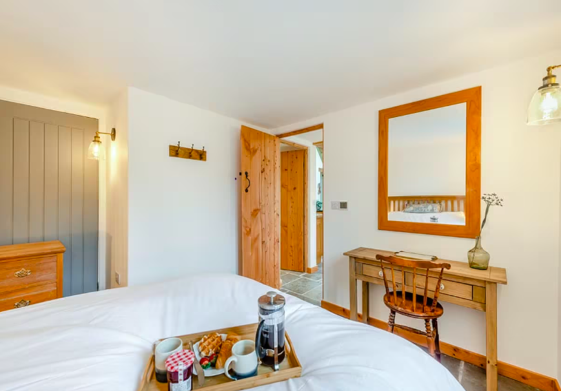 Teasel's beautiful ground floor bedroom has a comfortable kingsize bed. There is drawer and hanging space to store clothes and a dressing table. The mezzanine level has 2 single beds and drawer space. Should you require an extra single bed just let us know and will make that happen!